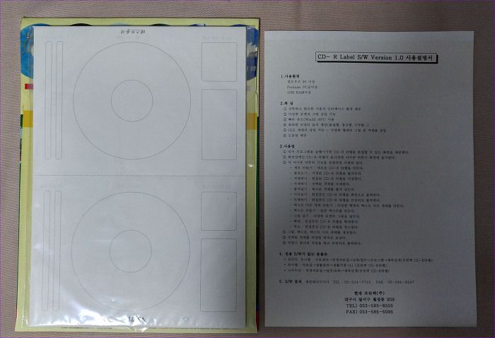 하나의 시트에 CD 라벨 2개를 인쇄할 수 있고, CD 케이스 측면에 붙일 수 있도록 되어 있는 부분도 있는데, 정확한 인쇄를 위해서는 전용 S/W를 설치해서 사용하면 됩니다.