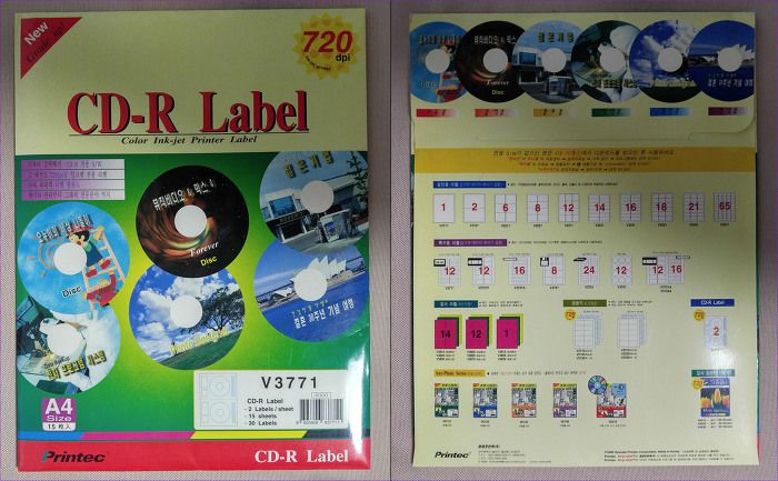 현대프린텍 (Printec) CD-R 라벨 V3771은 CD-R 뿐만 아니라 DVD-R 라벨로도 사용할 수 있는 칼라 잉크젯 프린터 라벨입니다.