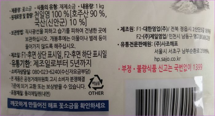 해표 꽃소금 1kg 가격, 원재료 및 함량, 보관방법, 유통기한 外