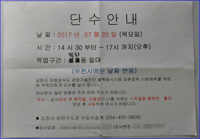 2017년 7월 20일 목요일 수돗물에 이물질이 섞여나오고 수압도 낮은 것을 보고 비상용으로 사용할 혼탁한 물을 받아둔 적이 있었는데, 김천시 지방상수도 관망기술진단, 블록화시스템 표본굴착 시편채취 공사가 있었다고 합니다.