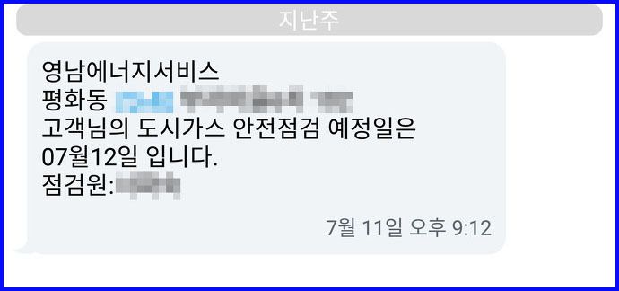 2017년 7월 11일 영남에너지서비스에서 도시가스 안전점검 예정일 안내 문자를 받았는데, 도시가스 안전점검 예정일인 7월 12일에는 도시가스 안전점검을 받지 못했습니다.