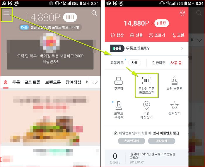 2) 화면 왼쪽에 창이 나타나면 [온라인 쿠폰 바코드 스캔] 부분을 선택합니다.