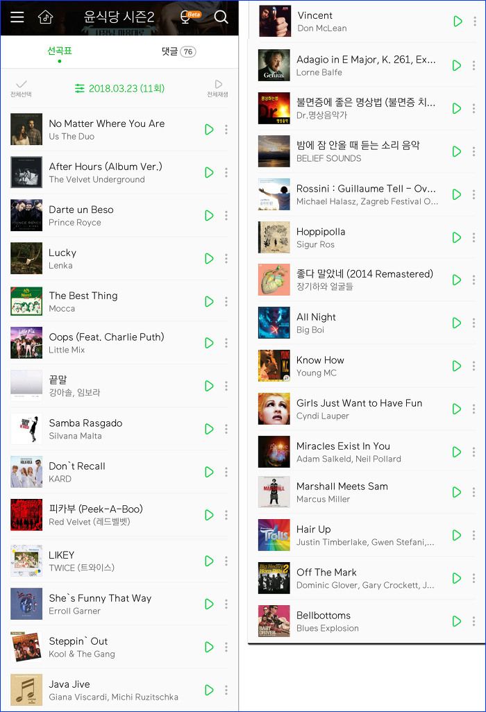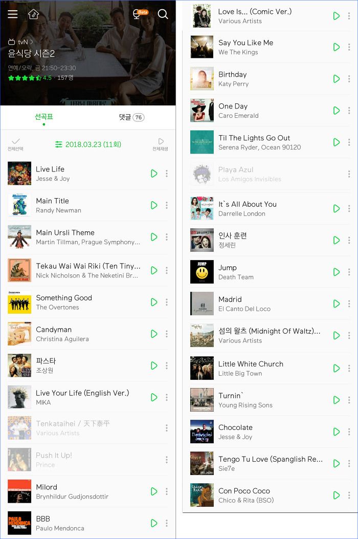 아래는 다음 TV프로그램 검색, 윤식당 시즌 2 방금그곡 탭에 있는 내용 일부로