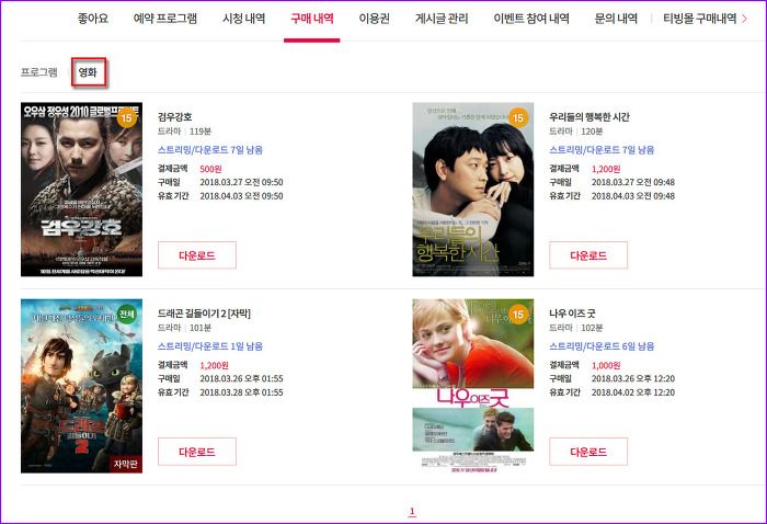 [영화]에서는 영화 콘텐츠를 구매한 내역을 볼 수 있습니다.
