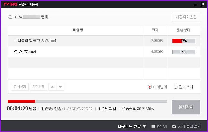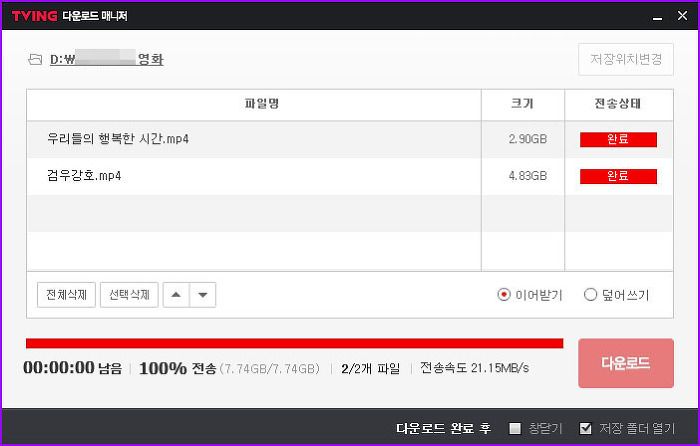 티빙 다운로드 매니저를 통해 구매한 파일을 다운받을 수 있습니다.