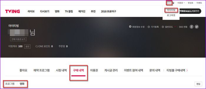 티빙 홈페이지( http://www.tving.com )로 가서 로그인을 한 상태에서