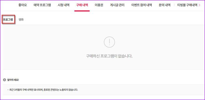 [프로그램]에서는 드라마, 예능 등 TV 프로그램을 구매한 구매 내역을 볼 수 있고