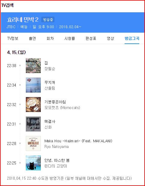 아래는 다음 TV검색 ' 효리네 민박 2 11회' 방금그곡을 참고한 것으로,