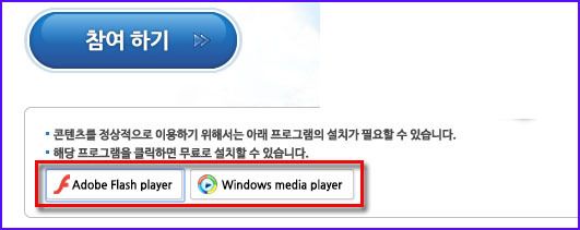 ▲ 콘텐츠를 정상적으로 이용하려면 어도비 플래시 플레이어와 윈도우 미디어 플레이어가 필요할 수 있는데, 관련 프로그램을 설치하려면 [참여하기] 아래에 있는 아이콘을 클릭하면 됩니다.