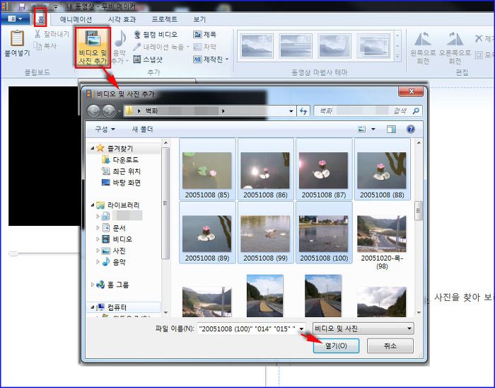 ▲ 특정 개체들을 여러 개 선택할 때는 Ctrl 키를 누른 상태에서, 마우스 왼쪽 버튼으로 불러올 개체들(사진, 동영상)을 클릭하면서 선택하면 됩니다.