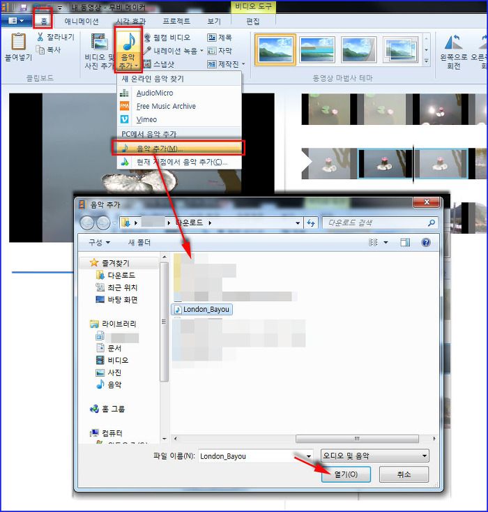 그리고 추가할 음악 파일을 선택하고 [열기]를 합니다.