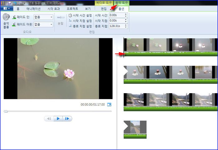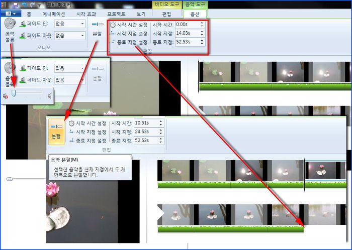 윈도우 무비메이커 음악 도구 옵션 - 소리 크기 조정, 페이드 인, 페이드 아웃, 분할, 종료 지점 설정 등