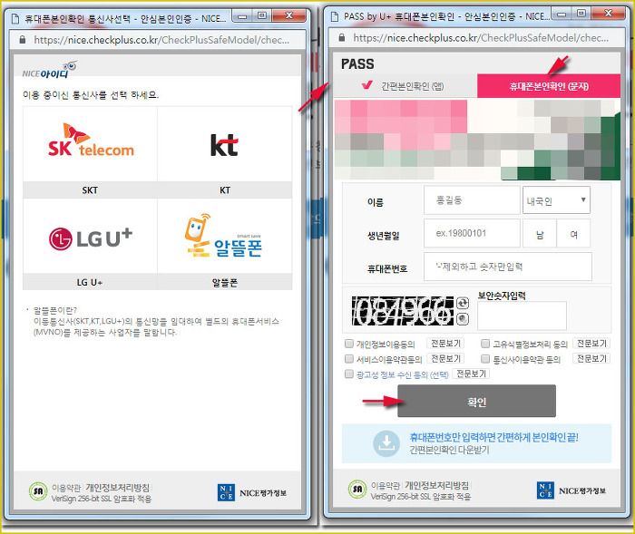 휴대폰 본인확인(문자) 탭에서