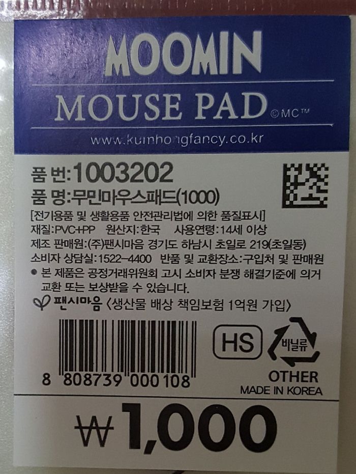 무민 마우스패드 (1000) 가격, 재질, 원산지, 제조 판매원 外