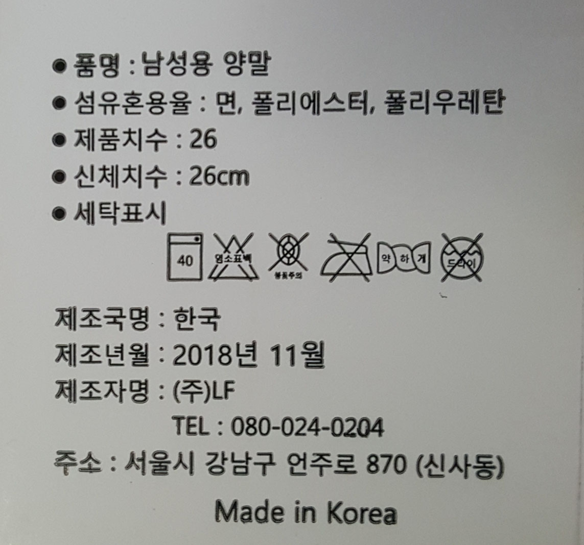 헤지스 (HAZZYS) 양말 3종 세트, 섬유혼용율, 제품치수, 신체치수, 세탁표시 外 정보