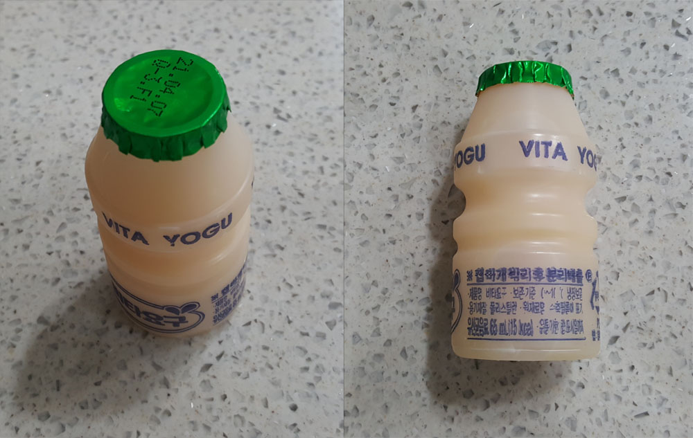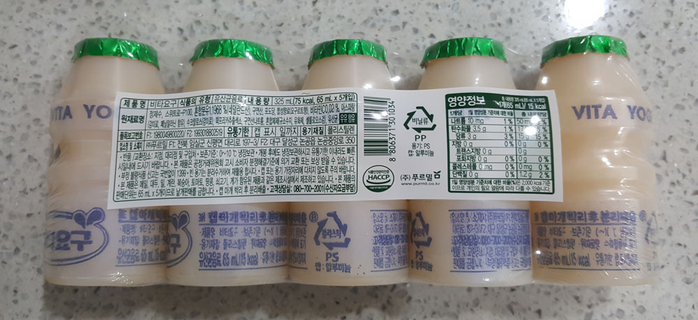 2021년 3월 28일 영동 이츠마트에서 1,300원(15개 묶음)에 구매한 푸르밀 비타요구(요구르트)는