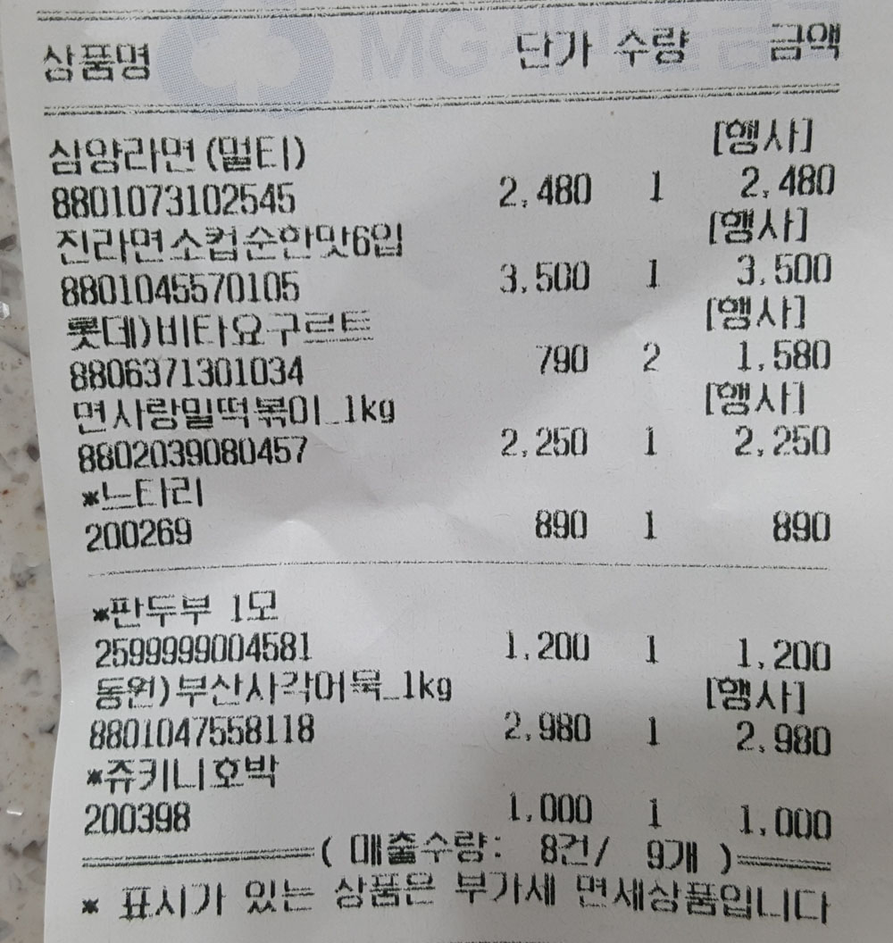 비싸지 않게 판매되는 할인(행사) 상품 위주로 여러 종류의 물건을 구매했습니다.