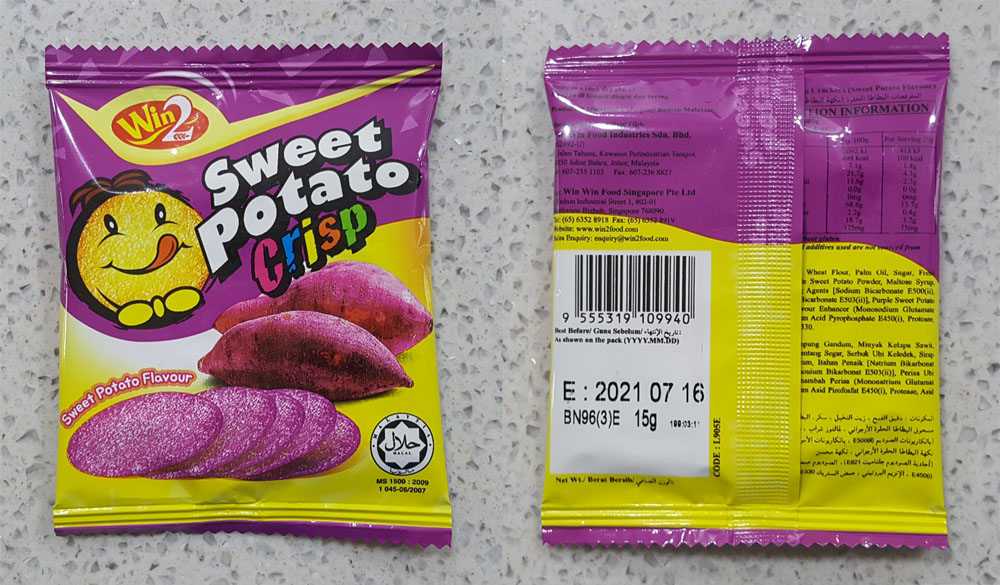 제품명 : 스위트 포테이토 크리스프 / 자색고구마파우더 7.3%, 합성향료 (자색고구마향) 0.2% 함유